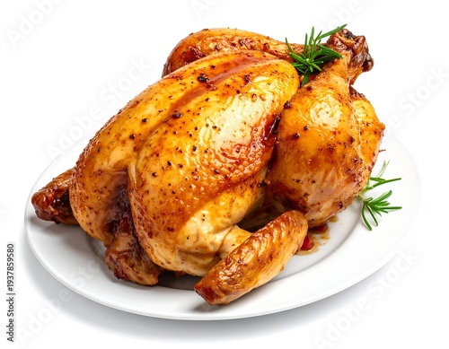 Roasted chicken on a white plate with rosemary garnish, presented against a white background