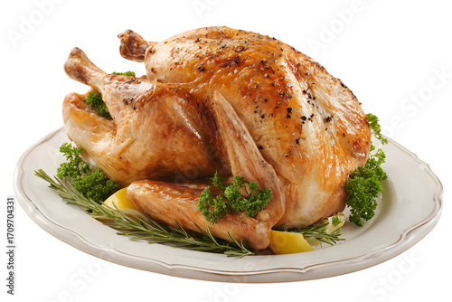 Roasted Chicken on Plate with Fresh Herb Garnish