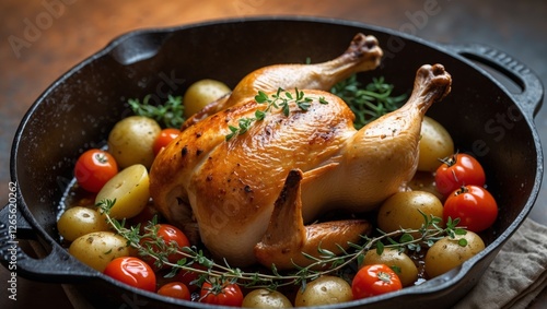Roasted Chicken with Potatoes and Tomatoes in a Pan.