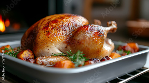 thanksgiving, food, dinner, holiday, autumn, season, feast, cooking, culinary, epicure, delicious, appetising, golden brown, juicy, roasted, herb, rosemary, sweet potato, autumn color, home cooking, comfort food, celebration, tradition, plating, food photography, closeup, still life, gastronomy, receipe, dish, meal, brown, orange, grey, kitchen, oven, chicken, turkey