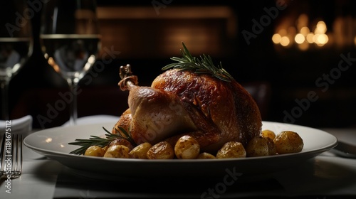 roast, chicken, roasted, rosemary, potato, eatery, dinner, food, meal, epicure, cookery, dish, plate, festive, celebration, holiday, christmas, thanksgiving, elegant, fine, dining, luxury, indoor, table, setting, dark, background, white, cooked, baked