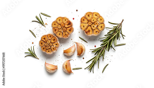 Roasted Garlic Bulbs and Cloves with Fresh Rosemary and Peppercorns Isolated on White