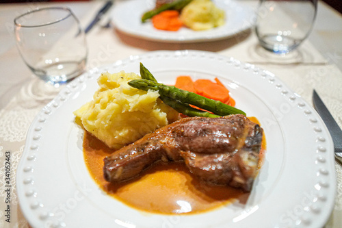 food, meat, dinner, meal, plate, pork meat, grilled, steak, beef, lamb, dish, chicken, vegetable, sauce, lunch, roasted, epicure, white, cookery, delicious, baked, cooked, vegetable, salad, duck