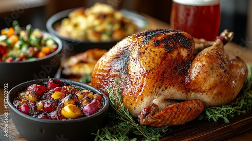 Roasted turkey, champagne, cranberries, and autumn produce on a festive table. Perfect for Thanksgiving or holiday dining decorations