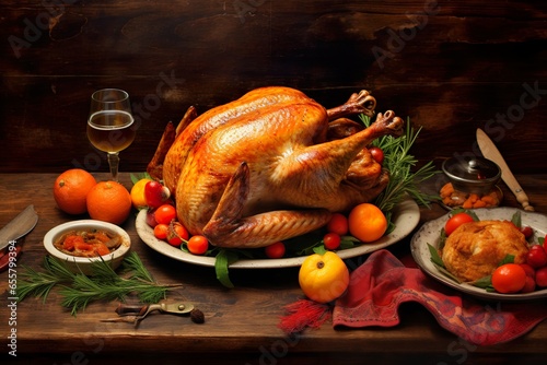 Roasted turkey on dining table for thanksgiving day