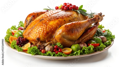 turkey, roast, poultry, bird, meat, food, meal, dinner, feast, holiday, thanksgiving, christmas, celebration, garnish, herb, parsley, lettuce, fruit, berry, cranberry, orange, lemon, garlic, onion, plate