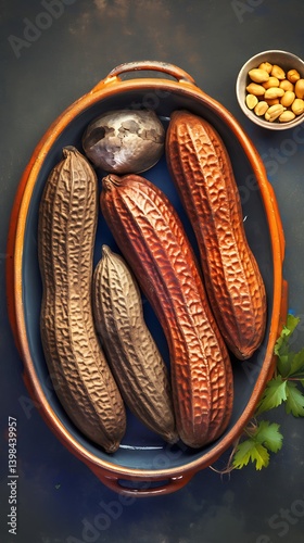 food, roasted, vegetable, dish, cooking, healthy, organic, receipe, cookery, vegan, vegetarian, dinner, lunch, epicure, brown, browned, oven, baking, top, view, fresh, ingredient, closeup, delicious, tasty, appetising, meal, nourishment, preparation, plate, pottery, autumn, fall, nut, almond, natural