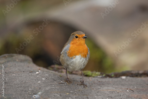 Robin on a tree trunk, close up, in a forest, in Scotland