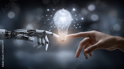 robot, human, hand, touch, datum, network, brain, light bulb, ai, technology, connection, futuristic, innovation, soft light, communication, digital, collaboration, future, cybernetic, intelligence, science, artificial intelligence, electronic, advanced, design, interaction, creativity, virtual, mechanical, precision, silicon, transmission, interactivity, symbolism, automation, integration, enhanced, synergy, device, vision