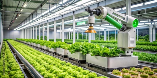 Robot Arm Machine Harvesting Hydroponic Lettuce in a High-Tech Indoor Farm Setting, Showcasing Automation, Agriculture Technology, and Sustainable Farming Practices