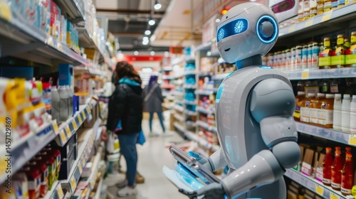 Robot assistant in a supermarket aisle. Advanced AI and robotics.
