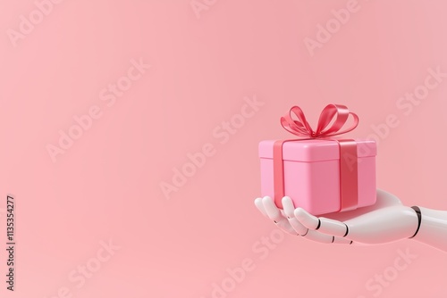 Robot hand presenting gift box with ribbon on pastel background futuristic technology and celebration concept in soft pink tones