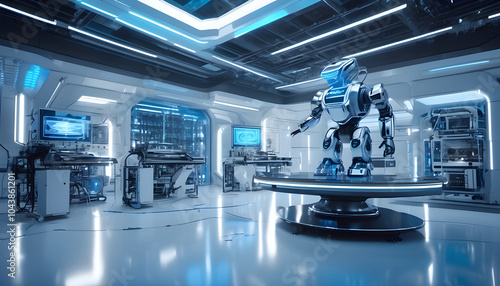 Robot in an underground laboratory with a blue-white atmosphere. Details of light from scientific equipment reflecting on the robot.