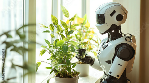 robot, potted plants, bright light, technology, nature, greenery, care, innovation, automation, sustainability, botany, artificial intelligence, ecology