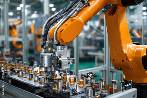 Robotic arm at work, assembling precision components in a high-tech factory setting.