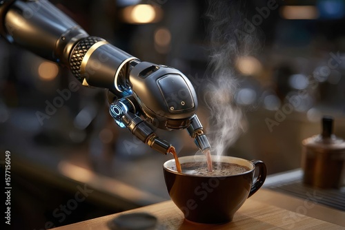 Robotic arm brewing coffee in a modern cafe setting with steam rising from the cup in the early morning