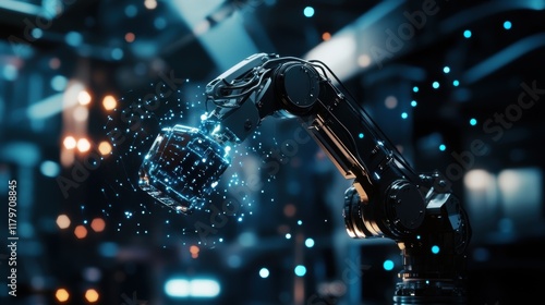 Robotic arm manipulates a translucent digital cube emitting glowing particles, showcasing advanced manufacturing technology in a futuristic factory environment