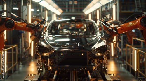 Robotic Arms Installing Headlights in High-Tech Automotive Factory Environment