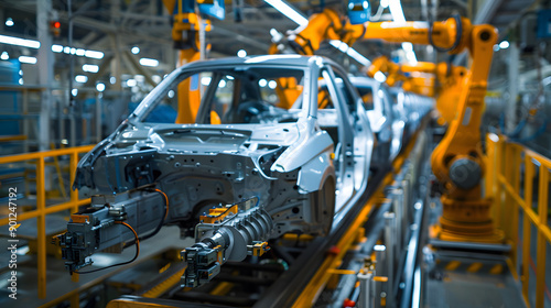 Robotic arms working on car bodies in an automotive assembly line within a modern manufacturing plant. The image showcases the efficiency and precision of automated production.