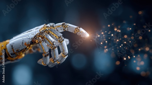 robot, hand, artificial, intelligence, ai, technology, futuristic, network, connection, digital, datum, point, line, glowing, light, dark, background, machine, learning, automation, innovation, science, future, progress, development, robotic, cybernetic, finger, touch, interface, node, connectivity, abstract, modern, design, tech, electronic, industrial, mechanical, white, gold, metal, structure, advanced, smart