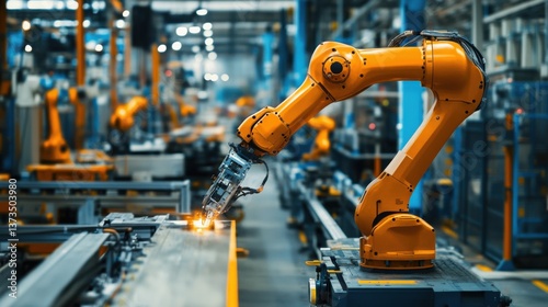 Robotics engineer creating robotic arms for precision manufacturing in automotive industry, factory with robotic arms and production lines, Manufacturing Tech style