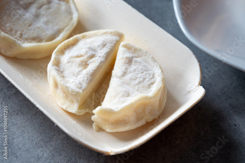 Rocamadour or cabecous soft goat AOC cheese with soft rind produced on farm in Perigord and Quercy on farmers market, departement Lot, France