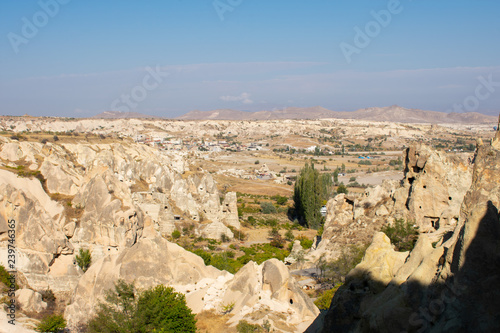 Rock formations in Goreme Open Air Museum. Most popular and famous place in Cappadocia, Turkey. Sunny day, clear blue sky