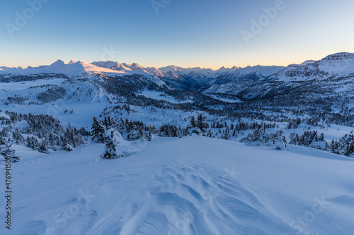 Rock Isle Lake, Sunshine Meadows cold sunset under blanket of snow in winter, Canada