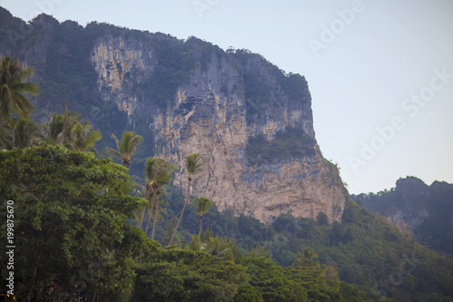 Rock mountain and palm trees in the early morning twilight, Krabi Thailand