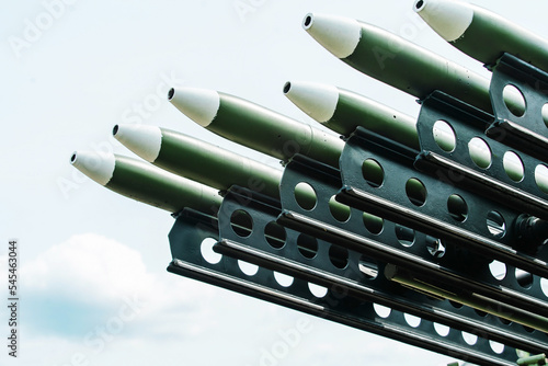 Rocket launcher in the weapons museum. A fragment of old-style ammunition on metal rails. Close-up