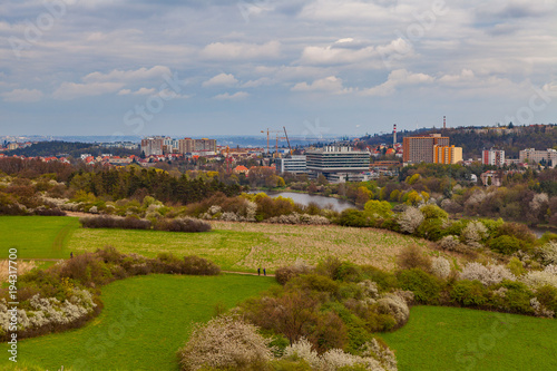 Rocks and hills of park Divoka Sarka in Prague, spring time. Wild nature park in the city. Houses at the background.