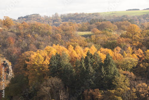 Rocky environment near the town of Dinant in Wallonia region, Belgium with a watercourse that forms natural meanders in autumn colour. The sunset illuminates a colourful forest