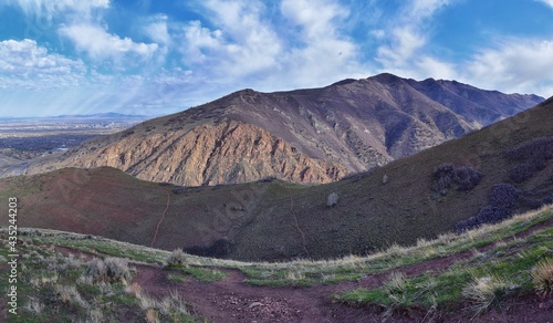 Rocky Mountains landscape views from Grandeur Peak hiking trail, Bonneville Shoreline Pipe Line Overlook Rattlesnake Gulch trail, Wasatch Front, by Salt Lake City, Utah. United States. USA