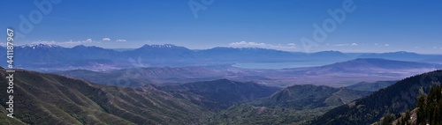 Rocky Mountains Lowe Peak views of Oquirrh range toward Utah Lake, Timpanogos, Wasatch Front by Rio Tinto Bingham Copper Mine, in spring. Utah. United States. USA.