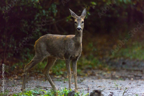 rain, summer, tree, doe, cervid, forest, animal, wildlife, mammal, wild, nature, female, field, roe, fur, beautiful, tail, brown, white tail, wilderness, european, fauna, outdoors, wood, 1, outside, alone, looking