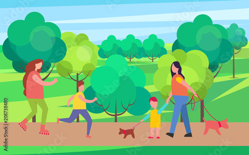 mother, mother, children, children, boy, male, adult, female, woman, young, mon, son, eltern, teenage, dog, pet, lead, leash, walk, stroll, saunter, puppy, port, roller, inline, skate, fun, activity, leisure, skater, healthy, exercise, active, lifestyle, fitness, speed, action, relaxation, outside, childhood, motherhood, parenthood, cute, nature, park, tree, sky, vector, illustration