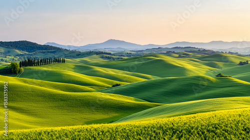 Rolling green hills stretch across the landscape under a soft pastel sky during golden hour, with distant mountains and scattered trees.