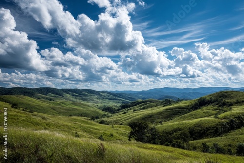 Rolling green hills under blue sky with fluffy clouds