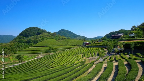 tea, plantation, green, hill, mountain, landscape, row, terrace, farm, agriculture, rural, scenic, nature, countryside, field, foliage, plant, leaf, bush, shrub, vibrant, sunny, bright, day, sky, blue, clear, tree, wood, forest, summer, japan, asia, serenity, peaceful, tranquil, beauty, growth, organic, cultivation, harvesting, tea leaf, hillside, slope