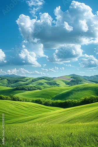 Rolling hills under blue sky, wide angle, daytime, vibrant