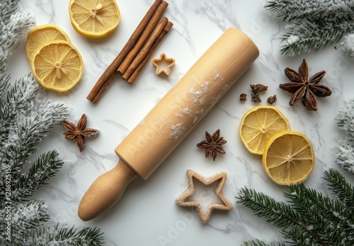 Rolling Pin Surrounded by Dried Lemon Slices, Cinnamon Sticks, Star Anise, and Green Fir Branches on a Marble Surface for Holiday Baking Inspiration