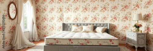 Romantic bedroom with box spring bed and floral patterns, floral patterns, cozy retreat, intimate atmosphere