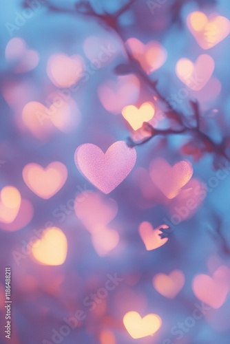 Romantic blurred heart-shaped bokeh lights background for love-themed designs.