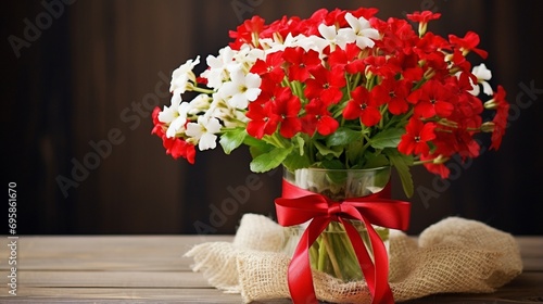 Romantic card with bunch of flowers / phlox in a glass vase decorated with pure white burlap and bright red jute bow. Full light floral composition. Rustic style of home decor.