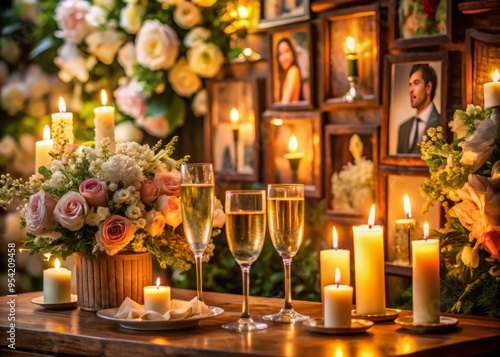 Romantic champagne toast in a candlelit setting with beautifully arranged flowers and a wooden photo display featuring