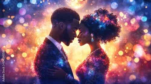 Romantic couple dancing under vibrant colorful lights with bokeh effects