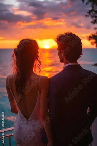 sunset, romantic, couple, balcony, ocean, sky, dress, suit, evening, view, silhouette, coastline, love, nature, scenic, travel, luxury, paradise, vacation, adventure, elegant, modern, serene, romance, proposal