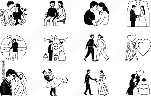 love, romance, couple, wedding, marriage, ceremony, engagement, kiss, bride, groom, human relationships, togetherness, forever, commitment, oneness, partnership, intimacy, affection, heart, celebration, happy, joy, family, black, white, line art, illustration, icon, design, vector, graphic, symbol, simple, minimalist, cute, sweet, adorable, cartoon, drawing, clip art