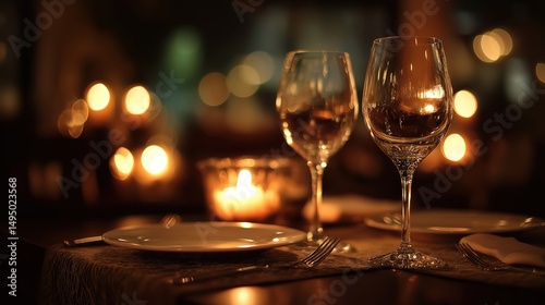 Romantic dinner for two with candlelit wine glasses, a moment of love and connection