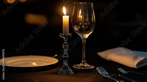Romantic dinner setting candlelight wine glass and silverware on dark table